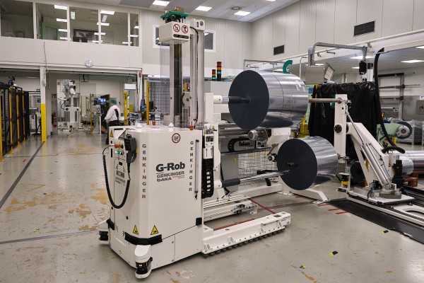 Ein internationaler Folienhersteller und -beschichter stellte Genkinger eine komplexe Aufgabe: Automatische Aufnahme von Folienrollen an Wickel-/Schneideanlagen und Abgabe der konfektionierten Rollen an einen Drehwechsler